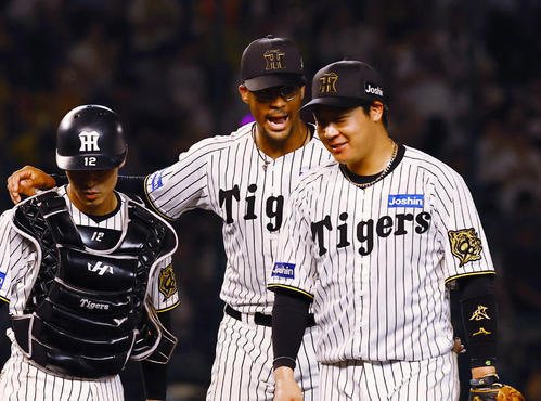 来日初完封を喜ぶ阪神デュプランティエ(中央)と大山(右)。左は坂本阪神大山悠輔内野手(31)が阪神からDeNAに移籍したジョン・デュプランティエ投手(31)の攻略に全力を注ぐ。