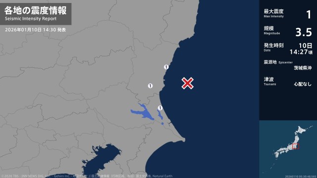 10日午後2時27分ごろ、茨城県で最大震度1を観測する地震がありました。