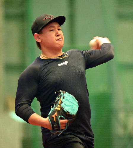 8日、室内練習場でネットスローを繰り返すオリックス宮城(撮影・和賀正仁)