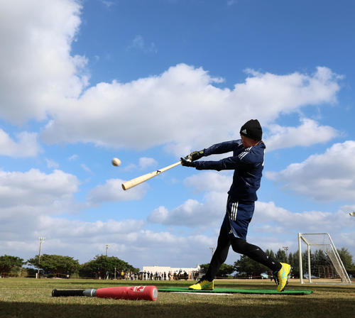 近本が謎の細い棒を練習に取り入れた。91センチの木製で、ティー打撃の合間に右手で強く振った。腕に刺激を入れることが目的。適度な棒を探して、鹿児島に本社があるホームセンター「ニシムタ」で110円で購入。ただ強く振りすぎてポキッと折れてしまった。「70円分くらいになっちゃいましたね。でも長すぎたのでちょうどいい」と短くなった相棒を大事そうにしまった。この日は初めてロングティーも行った。