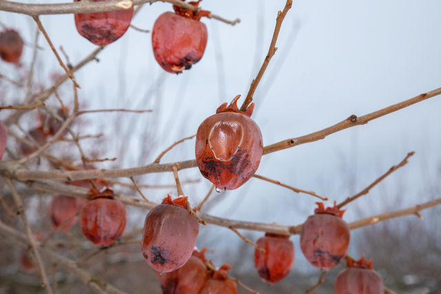 「木熟柿」は、青森県南地域で古くから栽培されてきた「妙丹柿(みょうたんがき)」が、字のごとく“木の上で熟した柿”。妙丹柿は秋に収穫されることの多い柿だが、秋の段階では渋が残るため、かつては干し柿として加工されるのが一般的だったという。干し柿ではなく、冬の夜の厳しい寒さで凍り、朝の日差しでゆっくりと溶けるという状態を何度も繰り返すことで、渋みが自然と抜け、優しい甘さへと変わっていくのが「木熟柿」。時には吹雪くこともあり、風に揺れた枝がぶつかって実の表面に傷がつくこともあるが、その厳しさに耐えた分、見た目とは裏腹に味わいはより深くなるという。年を越して木で十分に熟した妙丹柿を「木熟柿」として、手の届く範囲だけ収穫。高い位置の実は野鳥へお裾分けするという。