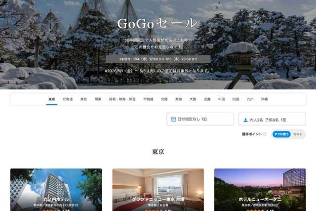 一休は、旅行予約サイト「一休.com」で、「GoGoセール」を1月14日正午から15日まで開催している。