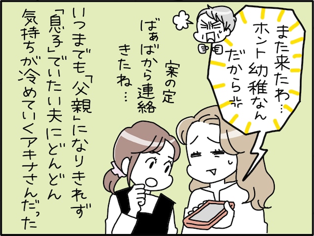 【マンガ】幼稚すぎる“実家依存の夫”。「父親」になりきれず「息子」でいたい夫に気持ちが冷めていく