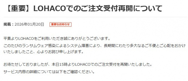 サイトでは「このたびのランサムウェア感染によるシステム障害により、長期間にわたり多大なるご不便とご心配をおかけいたしましたこと、心よりお詫び申し上げます」と伝えた。続けて「お待たせしておりましたが、本日15時よりLOHACOでのご注文受付を再開いたしました」と発表した。