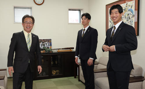 阪神山田脩也内野手(20)が20日、兵庫・西宮市内の球団事務所で行われた「20歳記念品贈呈式」に、百崎蒼生内野手(20)とともに参加した。