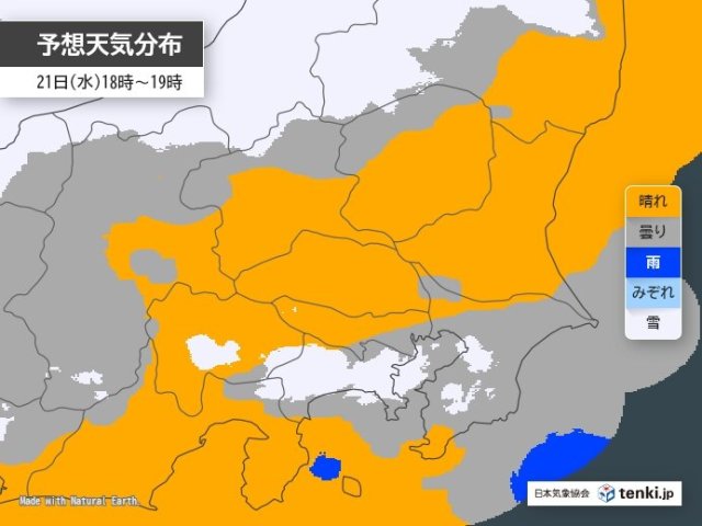 今日21日(水)の関東地方は、気圧の谷の影響で沿岸部ほど雲が広がりやすいでしょう。午前9時現在、神奈川県や千葉県を中心に雪雲や雨雲がかかっています。明日22日(木)の明け方までは、平野部でも雪の降る所があるでしょう。ちらつく程度の雪でも、路面の凍結に注意が必要です。