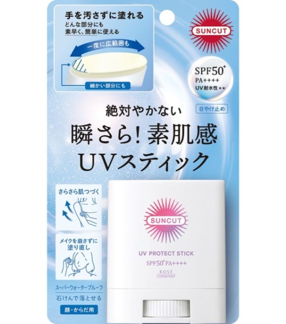 商品名/容量/特長 「サンカット® プロテクトUVスティック <日やけ止めスティック>」 20g 【SPF50 + PA++++ UV耐水性★★】 手を汚さず、いつでもどこでも、さっと塗り直しができるUVスティック。ベタつきストレスゼロで超さらさらな使用感。幅広オーバル型スティックで広範囲も、細かい部分も素早くUVケア。スーパーウォータープルーフ。