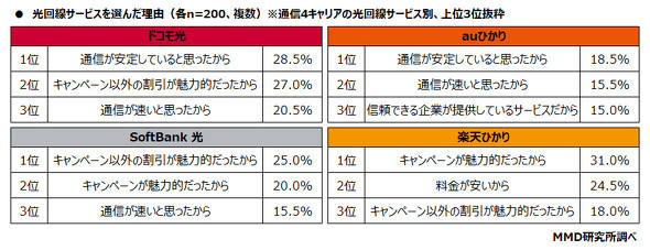 光回線サービスを選んだ理由について複数回答で聞いたところ、ドコモ光とauひかりは「通信が安定していると思ったから」、SoftBank 光は「キャンペーン以外の割引が魅力的だったから」、楽天ひかりは「キャンペーンが魅力的だったから」となった。