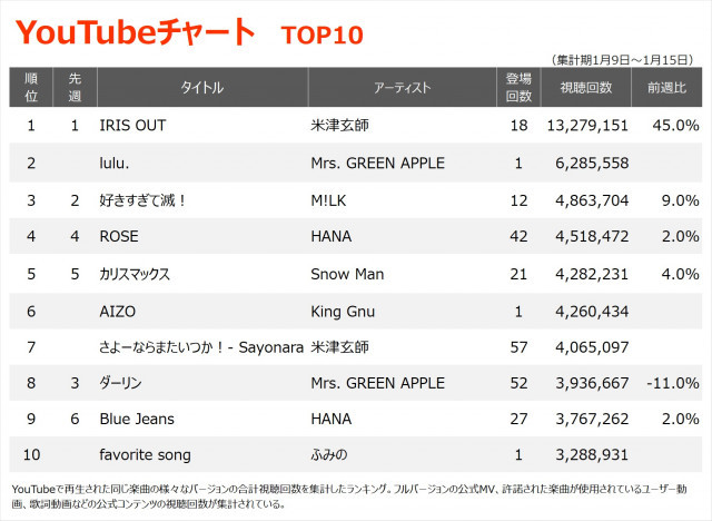 1位は米津玄師「IRIS OUT」(1328.0万回)。5週連続、通算17度目の首位を獲得した。同曲は劇場版『チェンソーマン レゼ篇』の主題歌として書き下ろした作品。昨年大みそかに『第76回NHK紅白歌合戦』に出演した影響もあり、年末から視聴回数が急増、9週ぶりに1000万回を突破した。