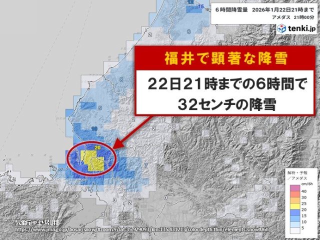 福井県敦賀市新保(しんぼ)では、22日21時までの6時間に32センチの顕著な降雪を観測しました。この強い雪は今夜遅くにかけて続く見込みです。嶺南東部では、短時間の大雪に伴って路面状況が急速に悪化し、大規模な交通障害の発生するおそれが高まっています。大雪に厳重に警戒してください。