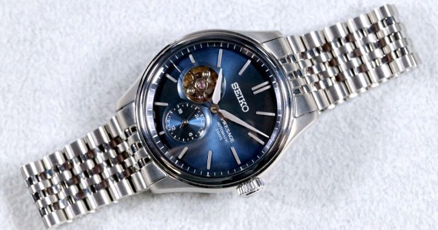藍色の文字板、丸みを帯びたケースライン、シンプルな3針、その中で24時間のインダイヤルとオープンハートが奥行きと機械式時計の情緒を生む。プレザージュのラインナップでも比較的穏やかな立ち位置の印象だ。色・形・見え方といった基本要素の積み重ねで個性を形づくっている点が、このモデルの性格をよく表している。