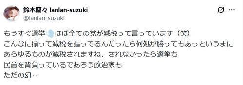 鈴木は「もうすぐ選挙 ほぼ全ての党が減税って言っています(笑)」と、与野党のほとんどが消費税減税を掲げて戦う衆院選に言及。「こんなに揃って減税を謳ってるんだったら何処が勝ってもあっというまにあらゆるものが減税されますね」と期待を寄せた上で、「されなかったら選挙も民意を背負っているであろう政治家もただの幻‥」とつづった。