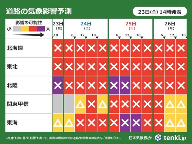 冬型の気圧配置が続き、明日24日(土)から明後日25日(日)にかけて、再び大雪のピークになりそうです。日本海側を中心に断続的に雪が降り、北海道から東海にかけて広い範囲で影響を受けそうです。発達した雪雲の帯・JPCZ(日本海寒帯気団収束帯)の動向にも注意が必要です。
