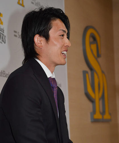 複数年の大型契約を結び、会見を行うソフトバンク周東(撮影・岩下翔太)