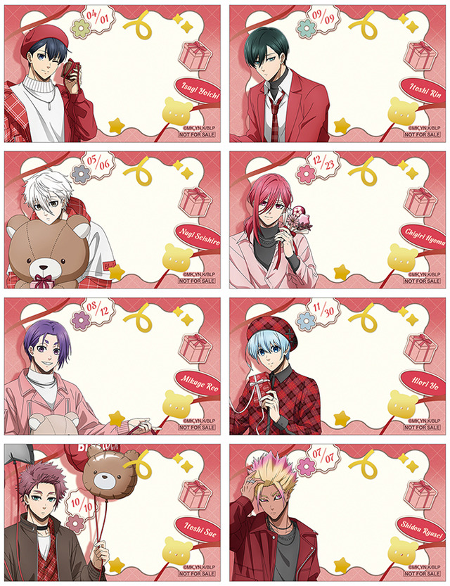 潔世一、糸師凛、凪誠士郎、千切豹馬、御影玲王、氷織羊、糸師冴、士道龍聖の8名が、赤を基調としたバレンタインらしい服装で登場だ。