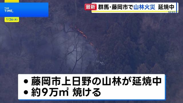 消防によりますと、藤岡市上日野の山林から出火し、現在も延焼中で、これまでにおよそ9万平方メートルが焼けたということです。これまでに、けが人は確認されていません。