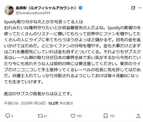 桑原は同サブスクについて「取り分少ねえとか文句言ってる人はおれみたいな権利守りたいとか収益最優先の人だよね」と言及。同サブスクが世界的に展開されていることを念頭に「影響力を使ってたくさんのリスナーに聞いてもらって世界中にファンを増やしてたくさんの人にライブに来てもらうほうがよっぽど儲かるぞ」と指摘した。