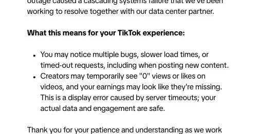 すでにネットワークは復旧したものの、停電によって連鎖的に発生した障害の影響が続いており、現在はその対応に当たっている段階。TikTok USDS Joint Ventureによれば、コンテンツの投稿・視聴時に読み込み速度が低下したり、動画の視聴数やいいね数、獲得した収益がゼロと表示されたりする問題が起こっているという。ただし、問題があるのはあくまで表示のみで、実際にデータが失われているわけではないとしている。