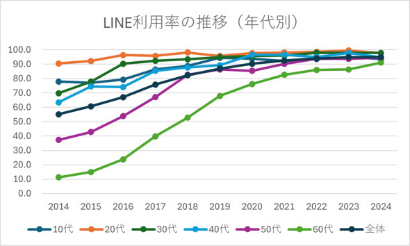 言うまでもなく、国内においてLINEの普及率は高く、総務省の調査によれば、2024年時点で94.9%に達しています。全ての世代でLINEが使われており、確かに電話番号を交換するよりも通話やメッセージを無料で利用できるLINEアカウントを交換した方が便利です。