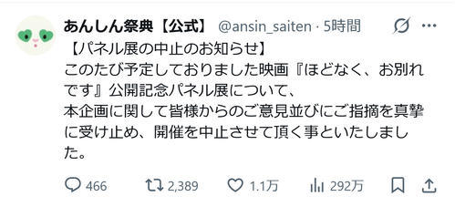 公式Xでは「このたび予定しておりました映画『ほどなく、お別れです』公開記念パネル展について、本企画に関して皆さまからのご意見並びにご指摘を真摯に受け止め、開催を中止させて頂く事といたしました」と報告された。