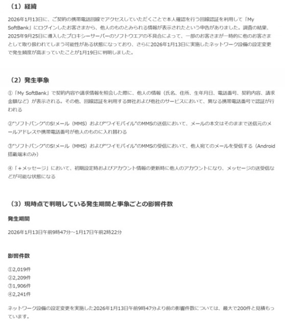 1月13日に、回線認証を利用して「My SoftBank」にログインした顧客から「他人のものとみられる情報が表示された」という申告があり、調査したところ、2025年9月25日に導入したプロキシサーバのソフト不具合により、一部の顧客が一時的に他の顧客として扱われる可能性がある状態になっていた。