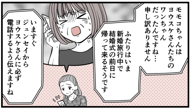 ヨウスケが引き取りたいと伝えると、ジュンセイさんは結婚式でモモコにリングドッグを務めてもらう予定だと話しました。さらに、友人への紹介や結婚式のムービーでもモモコを家族として扱っているため、式の後も手放すことはできないと言うのです……。さらにジュンセイさんが費用を全額負担するので、新しい子犬を迎えることで納得してほしいと提案してきました。