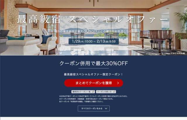 楽天グループは、旅行予約サイト「楽天トラベル」で「最高級宿スペシャルオファー」を1月29日午前10時から2月13日午前9時59分まで開催する。