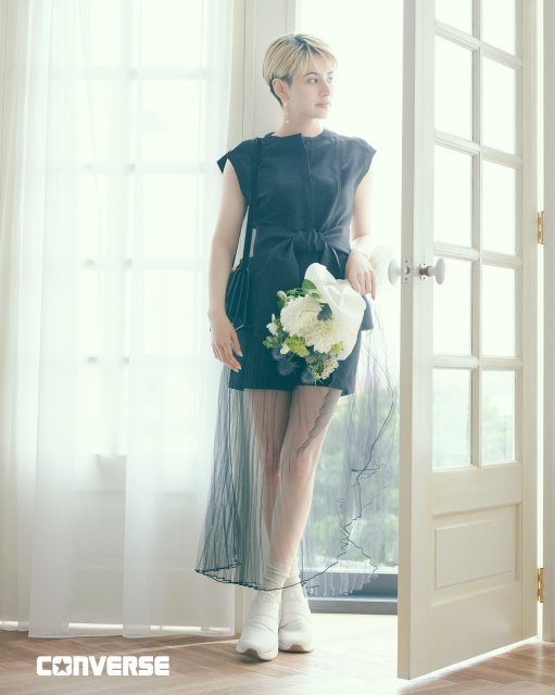最新ビジュアルでは、きれいめなワンピーススタイルから、ほどよくスポーティなカジュアルコーデまで、テイストの異なる着こなしを披露。どのスタイリングにも自然に溶け込むシューズの存在感とともに、ホランのスラリとした美脚が際立つ仕上がりとなっている。
