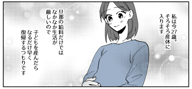 いま、私のお腹の中には赤ちゃんがいて、そろそろ産休に入ります。つい最近、ひとりのお子さんをもつシングルマザーのユウカさんが正社員として入社してきました。私と同い年の27歳。去年、旦那さんを事故で亡くし、頼る先もなく、ひとりで子育てをしながら頑張って生活しているそうです。