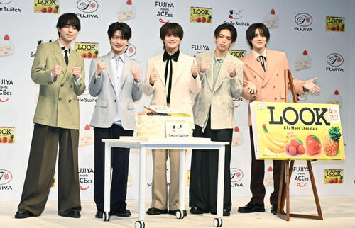 浮所飛貴(23)は「本当にうれしかったんですけど同時にめちゃくちゃ驚きました。不二家さんに負けないくらい甘いフェイスを見てもらって、たくさんの甘さを味わって欲しいです」とアピールした。那須雄登(24)は「幼い頃から一方的にお世話になっていて…」となじみあるブランドとの縁に感激。「僕たちは2月で結成2年目で勝負の歳なので、一緒にお仕事させていただく不二家屋さんに感謝です」と喜び「今年から両思い」とほほ笑んだ。