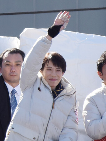 街頭演説で手を振る高市早苗首相(中央)=2日、甲府市 尾崎正直官房副長官は2日の記者会見で、高市早苗首相(自民党総裁)が衆院選の遊説中に痛めたとする手の症状について「政務や今後の公務に支障はない」と説明した。首相は同日朝も、応援演説に向かう前に首相公邸で医務官の治療を受けたという。