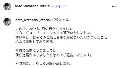 渡辺は「ご報告です。この度、2026年1月31日をもちましてスターダストプロモーションを退所いたしました。在籍中は、数多くのご縁と貴重な経験をいただきましたこと、心より感謝しております」と退所を報告し、感謝を伝えた。