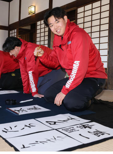 まず同市指定文化財の振徳堂で書道を体験し、それぞれ今季の目標をしたためた。その後は四半的射場で同市の無形文化財・四半的を体験。指導を受ける際にドラフト5位赤木晴哉投手(22=佛教大)は閉じる目を間違えるなどぎこちない様子だったが、本番では4本の矢をすべて的中させる腕前を披露して、周囲を驚かせた。本人も「野球と一緒でど真ん中を目がけました。今度から特技を聞かれたら“弓矢”と答えようと思います」と笑顔で振り返った。