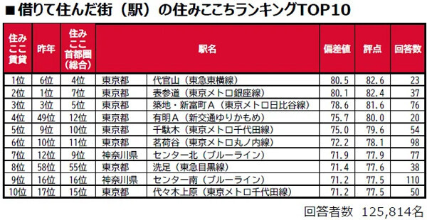 借りて住んだ街(駅)の住みここちランキングでは、1位の代官山が因子別で「行政サービス」「静かさ治安」「親しみやすさ」「賑わい」「防災」の5因子で1位、「交通利便性」で2位となり、極めて高い評価を得ている。