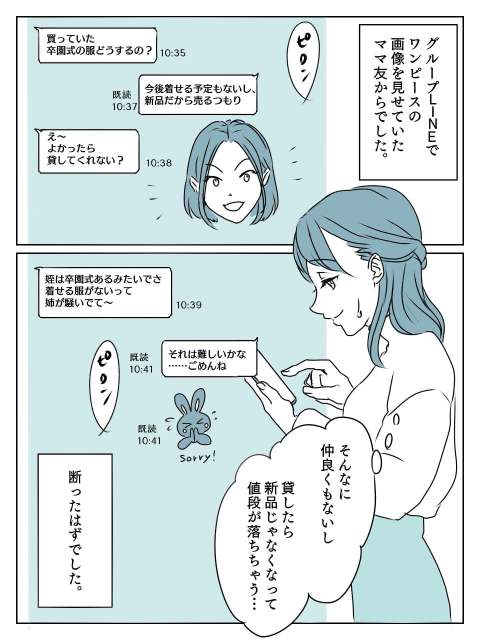 Aさんは娘の卒園式のために、奮発してワンピースを購入しました。しかし感染症の影響で式が中止となり、着る機会を失ってしまいます。フリマアプリに出そうと考えていた矢先、交流センターで知り合ったママ友から、「貸して」とのLINE。昔、ワンピ―スの画像を送ったことを覚えていたようです。