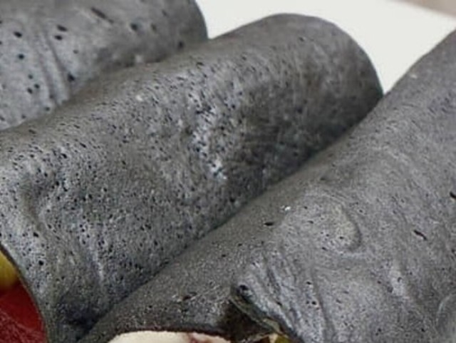 また、のりは竹炭パウダーを生地に練り込んだクレープで、ご飯の部分はホイップクリーム。細かく切ったキウイを仕込み、わさびに見せる工夫も秀逸です。
