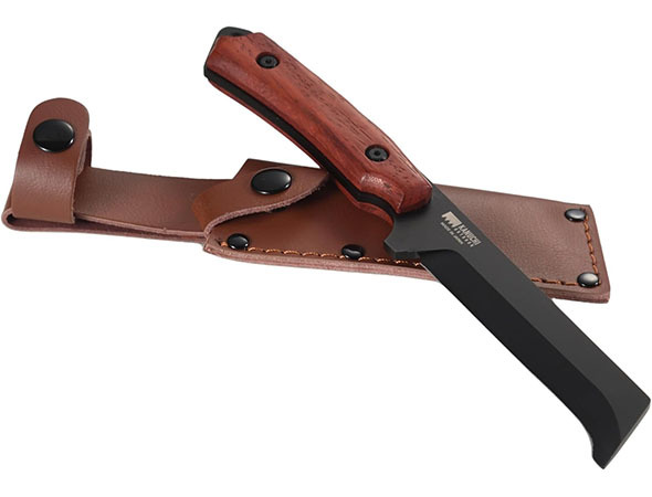 全長は約265mm、刃長は約110mm、刃厚は約4mm(SK85炭素鋼)。打ち下ろした勢いで刃先が破損するのを防ぐ突起「箸」が先端に付いています。ベルトループ付きの牛革ケースも付属します。実売価格(税込)は4000円台前半から。