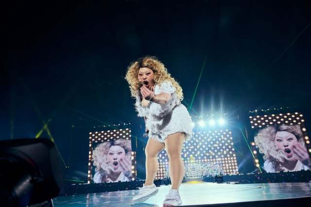 芸歴20周年を記念した今回の公演は、渡辺のこれまでの活動を振り返る内容となっており、デビュー当初を象徴するビヨンセの「Crazy in Love」を70人を超えるダンサーを従えたリップシンクパフォーマンス、そして「東京ドーム、ぶち上がっていくぞ!」といった力強い煽りで開幕。中央まで伸びたランウェイで繰り広げる熱いパフォーマンスに応えるように、観客は早速大きく盛り上がり、ダンスの疲れものぞかせつつ始まった次のコーナーでは、盛大に舞台を使った漫談コントでこれまでの20年の生い立ちを「ミュージカル〜渡辺直美物語〜」として振り返っていく。