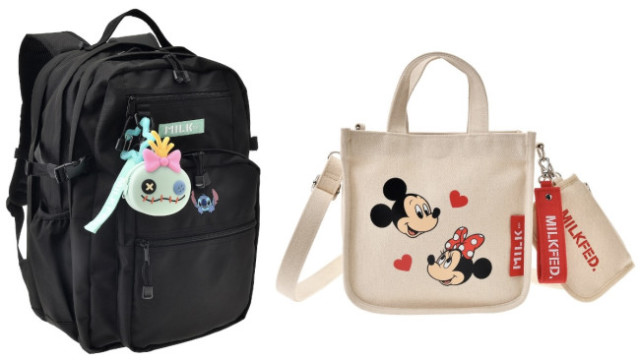 「MILKFED.」とのコラボ「バックパック」には、ミッキーマウスをデザインした32Lと、ミニーマウスとスティッチ&スクランプの2種から選べる23Lが用意されるほか、デイジーの刺しゅうを施した「ショルダーバッグ」や、ミッキー&ミニーをデザインした2WAY「トートバッグ」も用意される。