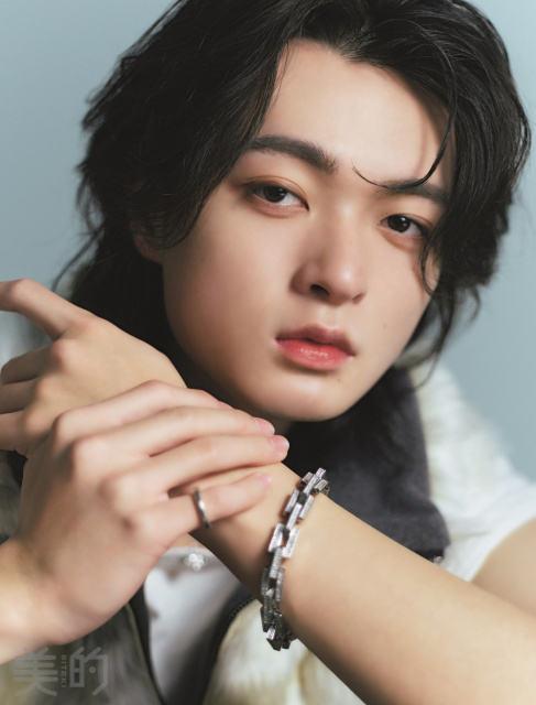 撮り下ろしカットでは、白T×デニムにファーを効かせたスタイルで、ロックなムードと品のあるたたずまいが同居。憂いを含んだアンニュイな表情、ふっとほどける視線の一瞬一瞬に宿るのは、少年から大人へと脱皮する過渡期ならではの魅力を放っている。“少年の純粋さ”と“ふとのぞく大人っぽさ”が交差する瞬間を丁寧に切り取り、今のRUIだからこそ放てる、繊細さと気品をまとったムードを映し出した。