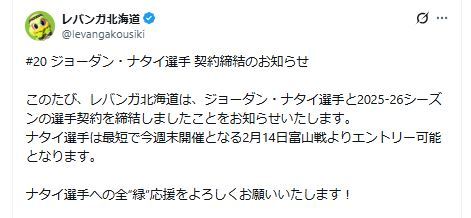 バスケットボール男子1部(B1)のレバンガ北海道は13日、前B3香川のSF/PFジョーダン・ナタイ(32)と契約締結したと発表した。ナタイはクラブを通じ「チームは今シーズン素晴らしい成績を残しているので、チームのさらなる成功に貢献できればと思っています。このチームでプレーし、新しいファンの皆さんにお会いできるのが待ちきれません」とコメントした。早ければ14日のアウェー富山戦から出場する。