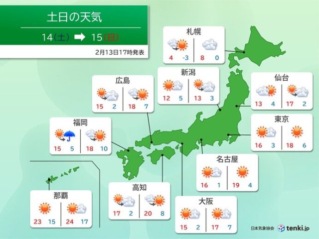 ÌÀÆü14Æü(ÅÚ)¤ÏÆüÃæ¤ÏÀ²¤ì¤ë½ê¤¬Â¿¤¤¤Ç¤·¤ç¤¦¡£ÆüËÜÉÕ¶á¤Ë¤ÏÃȤ«¤¤¶õµ¤¤¬Î®¤ì¹þ¤ó¤Ç¡¢³ÆÃÏ¤ÇÆüº¹¤·¤Î²¹¤â¤ê¤ò´¶¤¸¤é¤ì¤½¤¦¤Ç¤¹¡£Í½Áۺǹⵤ²¹¤Ï¡¢ÅìµþÅÔ¿´¤ä̾¸Å²°¤Ç16¡î¤È3·î²¼½Üʤߡ¢Âçºå¤äÊ¡²¬¤Ï15¡î¤È3·îÃæ½Ü¡Á²¼½ÜʤߤÎͽÁۤǤ¹¡£¤Þ¤¿¡¢ÀçÂæ¤Ï13¡î¤È4·î¾å½Üʤߡ¢»¥ËڤǤâ4¡î¤Þ¤Çµ¤²¹¤¬¾å¤¬¤ëͽÁۤǤ¹¡£