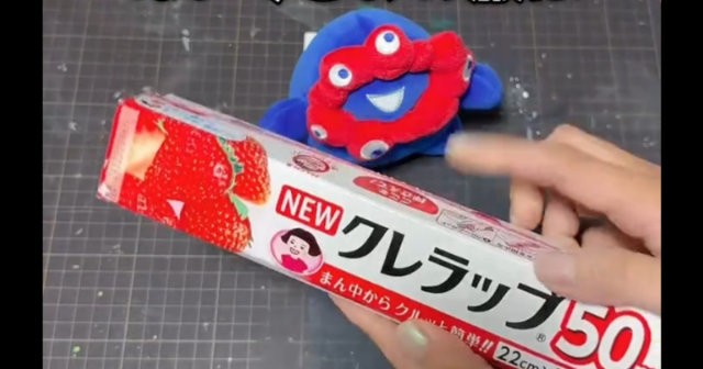 今回は、手のひらサイズの「ミャクミャク」のぬいぐるみが着られる“小さな洋服”を制作します。動画では、いきなりぬいぐるみの全身を覆うようにラップを巻くところからスタート。何をするのかと思ったら……?