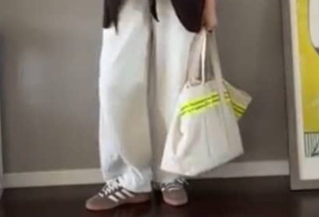1つ目のコーデはUNIQLOのスウェットバレルレッグパンツ(ホワイト/XL)に、UNIQLOのソフトリブクルーネックTとメンズニットジャケット、ブラウンのスニーカーを組み合わせています。さえさんのイチオシは、GUのトライアングルスカーフとのこと。ニットジャケットとも色が合っていて、肩にラフにかけるだけでも、前で結んでもオシャレに見えます。