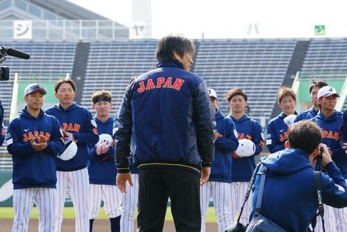 侍ジャパンの選手たちの前であいさつする松井氏(撮影・垰建太)<侍ジャパン強化合宿>◇14日◇宮崎