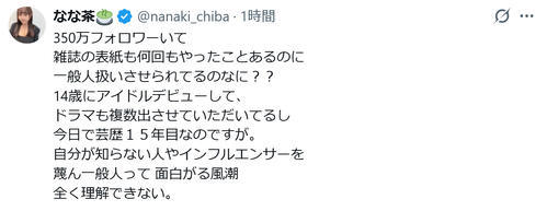 「14歳にアイドルデビューして、ドラマも複数出させていただいてるし今日で芸歴15年目なのですが」と主張。「自分が知らない人やインフルエンサーを蔑んで一般人って面白がる風潮 全く理解できない」と投げかけた。