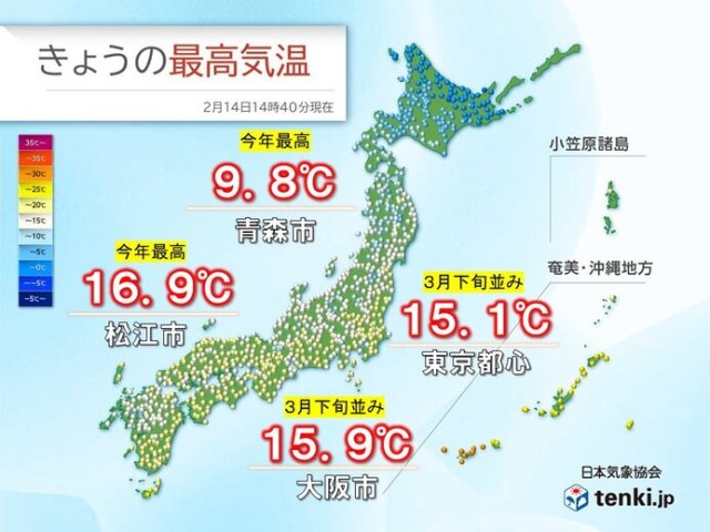 ÆüÃæ¤Ïµ¤²¹¤¬¥°¥ó¥°¥ó¾å¤¬¤ê¡¢14»þ30ʬ¤Þ¤Ç¤ÎºÇ¹âµ¤²¹¤ÏÀÄ¿¹»Ô¤Ç9.8¡î¡¢½©ÅĻԤÇ10.6¡î¡¢ÀçÂæ»Ô¤Ç13.9¡î¤Èº£Ç¯¤³¤ì¤Þ¤Ç¤Ç°ìÈ־夬¤Ã¤Æ¤¤¤Þ¤¹¡£ÅìµþÅÔ¿´¤Ï15.1¡î¤È8Æü¤Ö¤ê¤Ë15¡î°Ê¾å¤È¤Ê¤ê¡¢3·î²¼½ÜʤߤÎÃȤ«¤µ¤È¤Ê¤Ã¤Æ¤¤¤Þ¤¹¡£Âçºå»Ô¤Ç15.9¡î¤È26Æü¤Ö¤ê¤Ë15¡î°Ê¾å¤È¤Ê¤ê¤Þ¤·¤¿¡£¾¾¹¾»Ô¤Ç16.9¡î¡¢Ä»¼è»Ô¤Ç16.4¡î¤Èº£Ç¯¤³¤ì¤Þ¤Ç¤Ç°ìÈÖ¤ÎÃȤ«¤µ¤È¤Ê¤Ã¤Æ¤¤¤Þ¤¹¡£