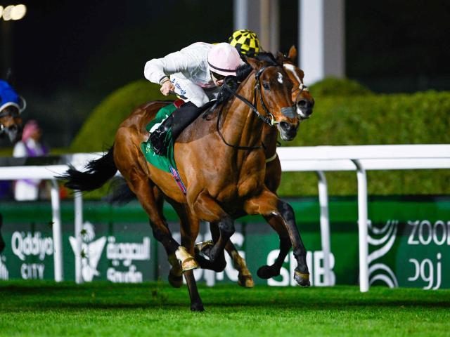 レッドシーターフHCを制したサンズアンドラバーズ(撮影:高橋正和) 現地時間14日、サウジアラビアのキングアブドゥルアジーズ競馬場で行われたレッドシーターフハンデキャップ(G2・芝3000m)は、D.マクモナグル騎手騎乗のサンズアンドラバーズ(セ5、愛・J.オブライエン厩舎)が直線の追い比べを制して優勝した。勝ちタイムは3分11秒560。