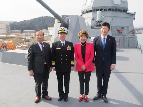 これに先駆けて、舞鶴港で海上自衛隊の護衛艦「ふゆづき」の艦内を見学。西脇匡史舞鶴地方総監、藤原直哉幕僚長、谷公一衆議院議員たちと名物「海自カレー」を食べながら「厳しい状況の中で、国の安全を守っていただいていることに感謝します」と話した。