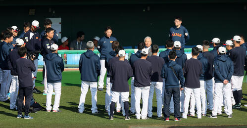 練習の冒頭では、榊原定征コミッショナーが円陣の前に立ち、侍ジャパンメンバーを激励した。